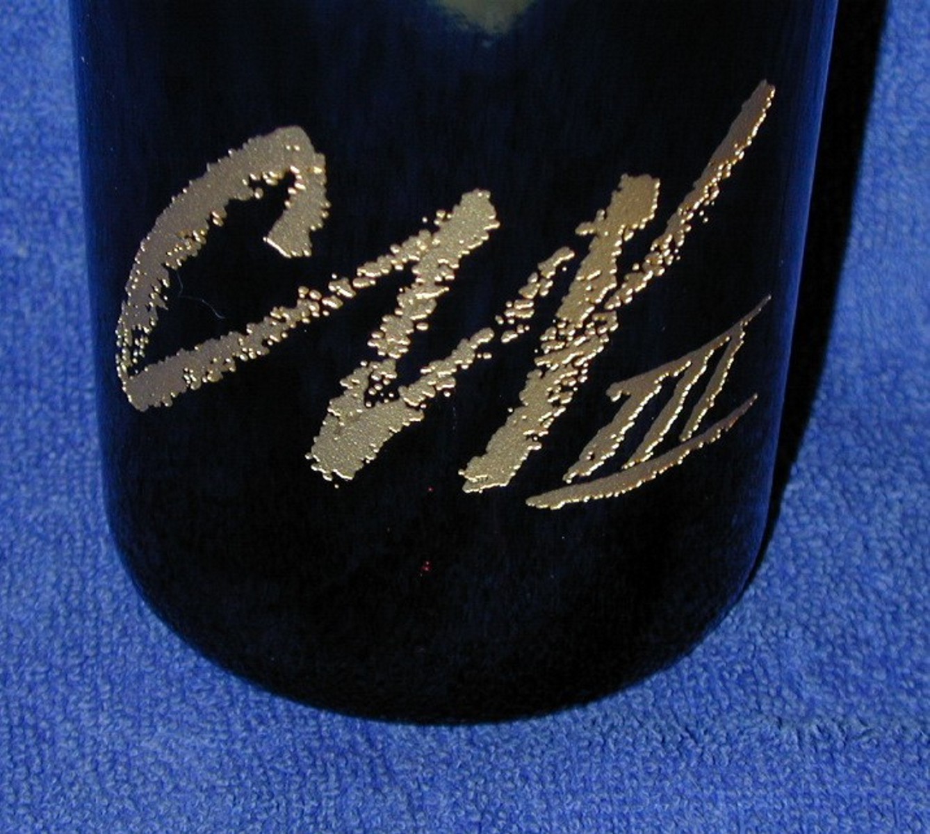 Wine bottles can be deep engraved with logos and other information for any occasion. Pictures shown here are backfilled with bright gold. Email us with your requirements. |